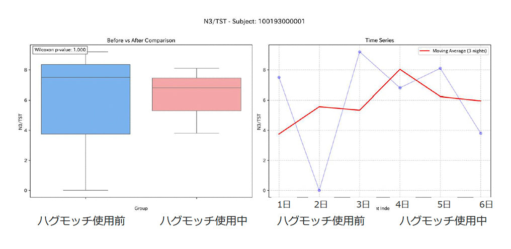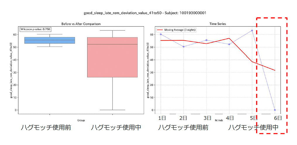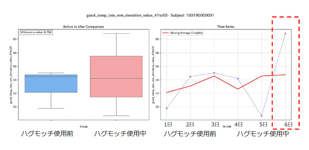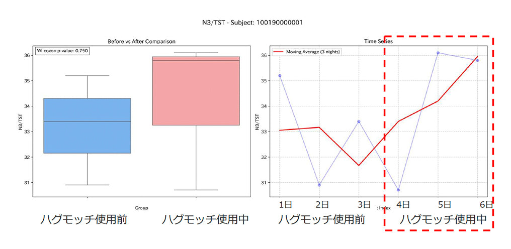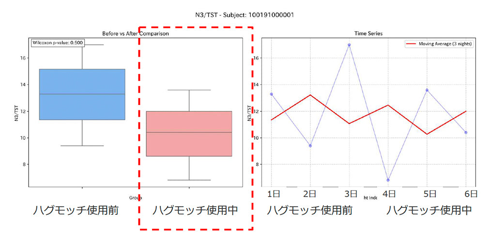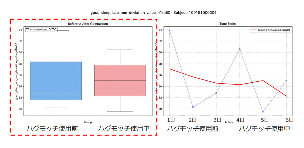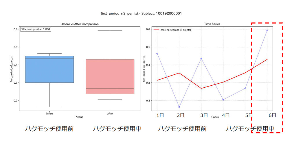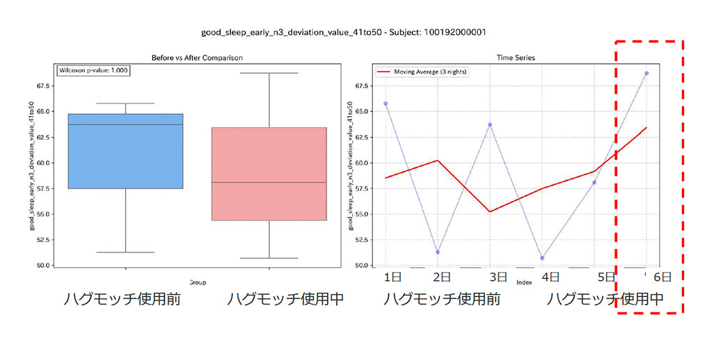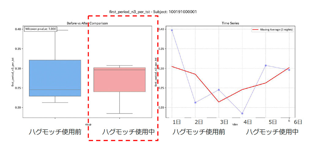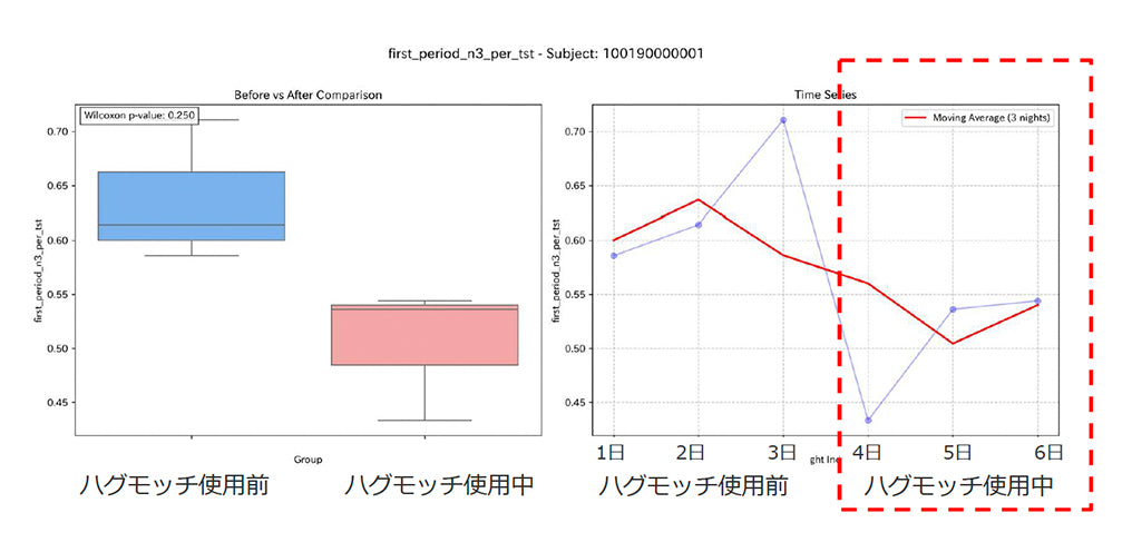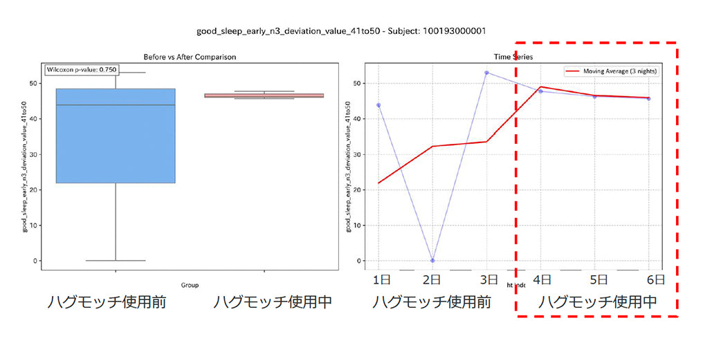 ※調査対象:41〜49歳の4名の女性 / 調査方法:通常の枕で3日間、ハグモッチで3日間の睡眠を脳波データを計測
