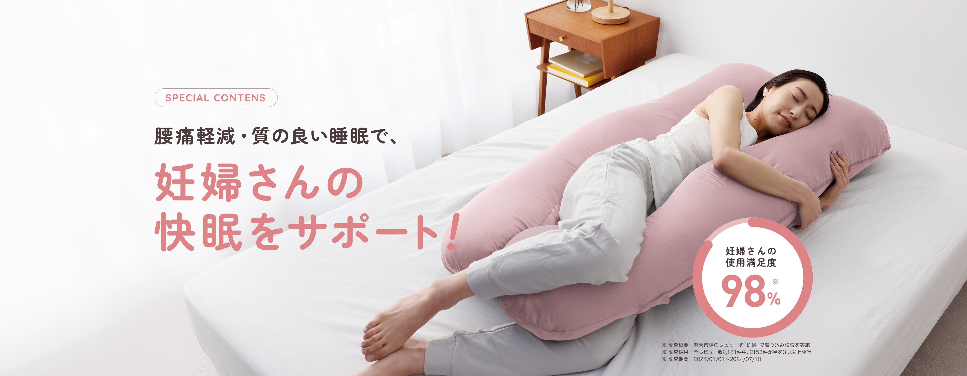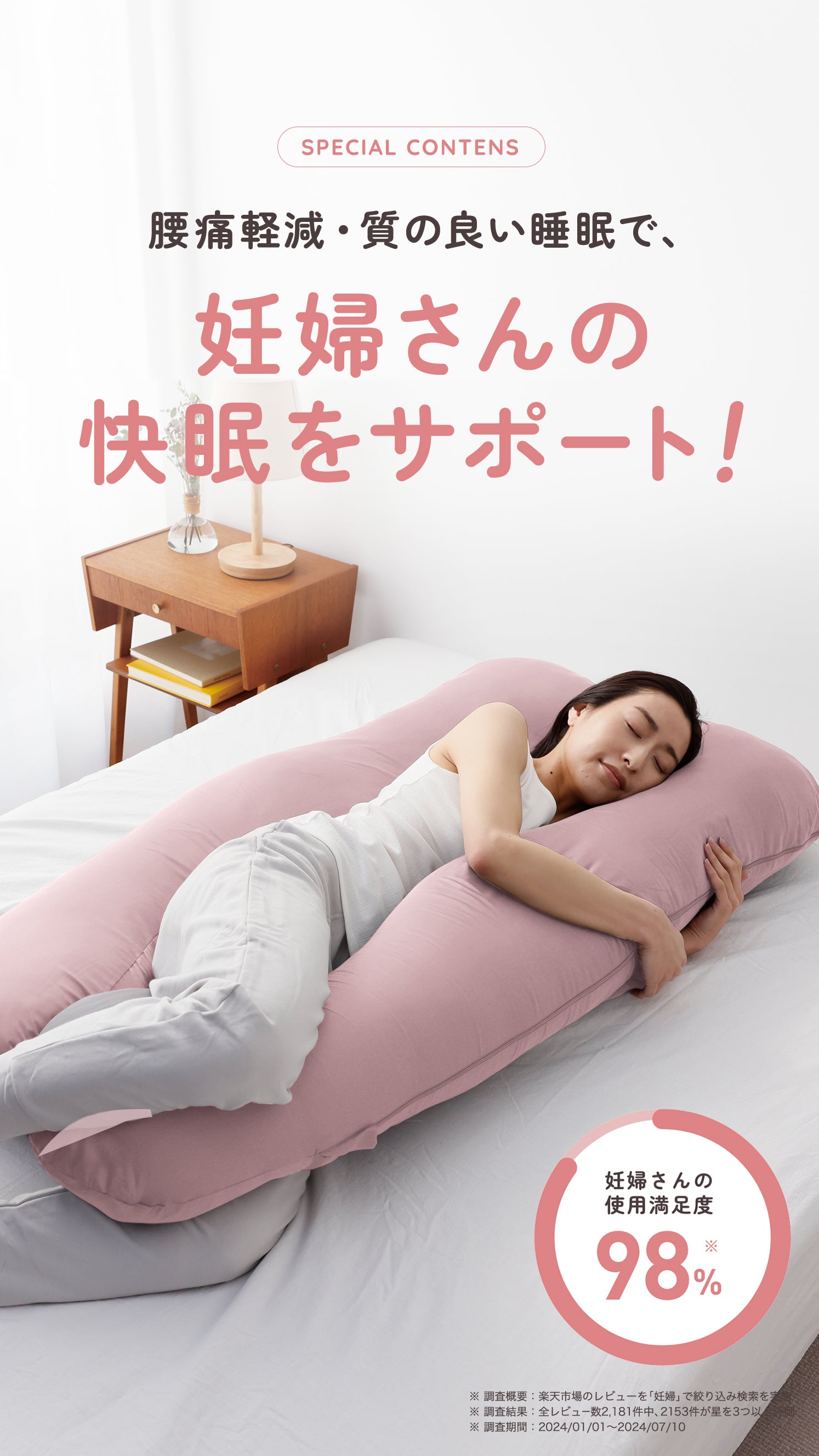 妊婦さんの体にやさしくフィットし、快適な睡眠をサポート。抱きしめるだけで心が落ち着き、ストレス解消にも。赤ちゃんと一緒に安心して眠れる、妊婦さんの強い味方です。